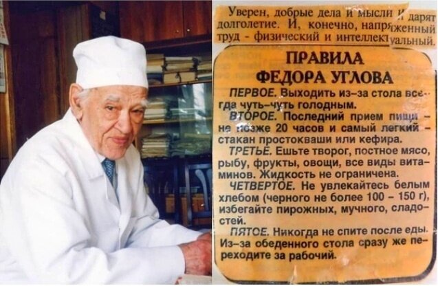 Фёдор Углов, это советский и российский хирург, писатель и общественный деятель, доктор медицинских наук, профессор. Предлагаю вам ознакомиться с его советами, а далее мы их разберём, почему именно они так работают. Добрые дела и добрые мысли дарят долголетие. Это несомненно так. Существует множество болезней, которые могут приходить только лишь от стресса. А добрые мысли и дела как раз защищают от этого. И таким образом человек меньше болеет и живёт дольше. Физический и интеллектуальный труд полезен тем, что он нас поддерживает. Если мы не пользуемся мышцами, то они начинают атрофироваться. А мозг это та же мышца. Если мы перестаём работать головой, то мозг постепенно перестаёт работать, это логично. Так и физически. Если мы будем каждый день делать зарядку, например, то это нам накинет несколько лет безусловно. Про еду абсолютно верно. Наш организм регенерируется за счёт гормона роста. Регенерация даёт нам возможность долго жить. Значит нам нужен гормон роста. А он вырабатывае