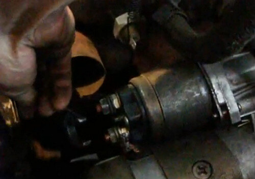 Чтобы запустить двигатель вам понадобится рожковый ключ, такого размера, рожки которого совпадали бы с силовыми клеммами втягивающего реле (см. фото). Затем, ставим автомобиль на нейтральную передачу вставляем ключ в замок зажигания и проворачиваем в положение включения зажигания. После этого берем тот самый рожковый ключ и замыкаем клеммы реле. Это действие приводит к тому, что стартер запускается без втягивающего реле и соответственно приводит в движение маховик двигателя.