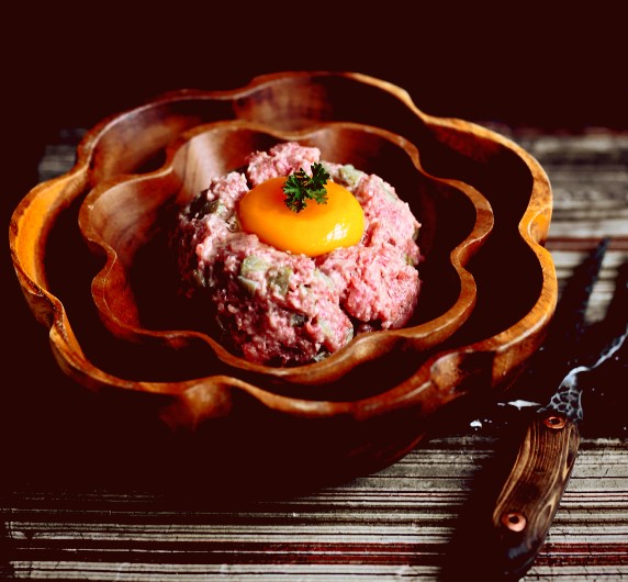 Что такое тартар? Это измельченная говяжья вырезка, которую смешивают с мелко нарезанными маринованными огурцами и каперсами, и подают с куриным либо перепелиным яйцом. Это очень вкусная и аппетитная закуска. Ингредиенты: 1 луковица 70 г маринованных огурцов 50 г. каперсов 0.5к г говяжьей вырезки 1 апельсин и половина лимона 3 столовые ложки дижонской горчицы 2 чайные ложки оливкового масла 1 перепелиный желток или куриный молотый перец и соль 1) Огурцы и лук измельчите. Каперсы разрежьте пополам, очень мелко нарежьте. Очень мелко нарежьте мясо. Выжмите сок из лимона и апельсина. Смешайте все подготовленные ингредиенты, добавьте горчицу и оливковое масло. Посолите и еще раз перемешайте. 2) Выложите на блюдо тартар используя формовочное кольцо. Сверху выложите перепелиный желток(или куриный). Подавайте незамедлительно.