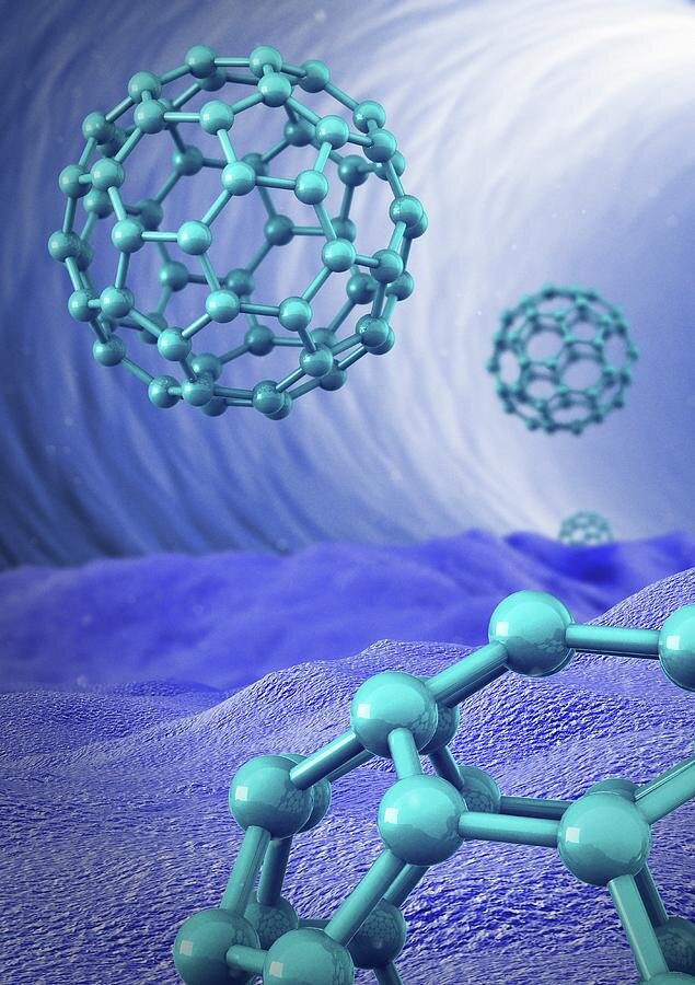 В зависимости от числа атомов в молекуле фуллерены по форме напоминают футбольный мяч (С60) или мяч для регби (С70).