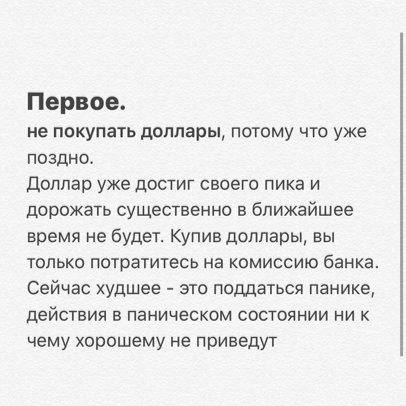 Доллар вырос. Финансовый совет: Первое. не покупать доллары, потому что уже поздно. Доллар уже достиг своего пика и дорожать существенно в ближайшее время не будет. Купив доллары, вы только потратитесь на комиссию банка. Сейчас худшее - это поддаться панике, действия в паническом состоянии ни к чему хорошему не приведут. Второе. купить электронную технику, обувь или одежду, покупку которых откладывали (в связи с нынешним ростом курса доллара логично подорожание именно данной категории товаров). Путешествия в связи с короновирусом не актуальны. Наконец, капитал, если он у вас есть, лучше Всегда распределять минимум в трёх валютах (например: 33 % - рубли, 33 % - доллары, 33 % - евро). При подобном распределении вам не страшны недавние скачки курса доллара. Бонус для инвесторов! помнить, что после кризиса наступит удачное время для инвестиций и скупки подешевевших ценных бумаг (несмотря на то, что сегодняшняя ситуация на финансовых рынках - это ещё не кризис, первые звоночки уже слышны)