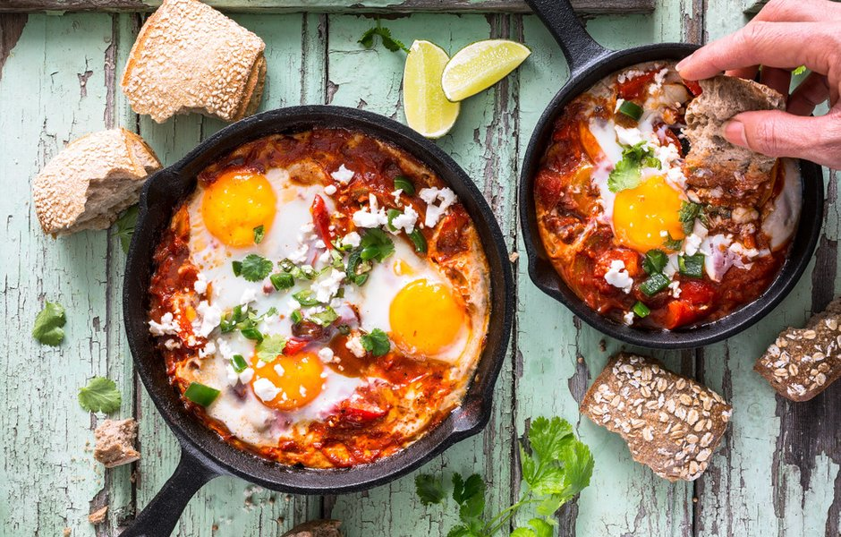 Шакшука — это израильская яичница с помидорами, которую традиционно едят на завтрак. Подается блюдо только на порционной сковороде — считается, что шакшука на тарелке теряет весь свой вкус. Единого рецепта не существует, но три правила незыблемы: яйца должны быть свежайшими, чтобы желток не растекся при жарке, помидоры — очень ароматными, а готовить нужно только на оливковом масле.
