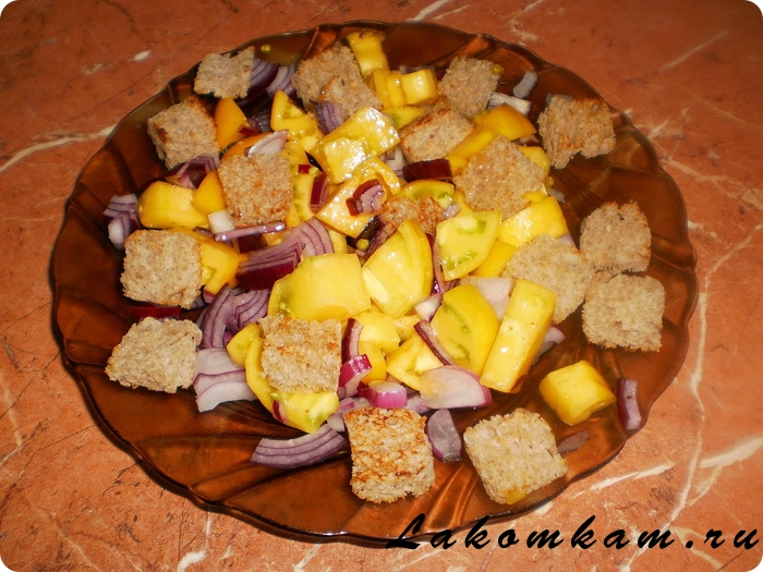 Соединяем: помидор, лук и хлеб. Поливаем маслом, перемешиваем и подаём немедленно.