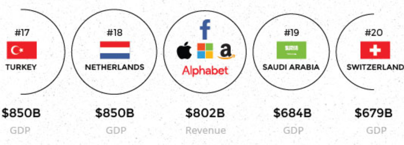 Забавная статистика для понимания масштабов. 5 крупнейших IT-компаний: Facebook, Apple, Microsoft, Amazon и Alphabet (если что: это Google) в сумме зарабатывают 802 миллиарда долларов в год. ВВП Нидерландов - 850 миллиардов. А Швейцарии - всего лишь 679 миллиардов. Несколько компаний в сумме зарабатывают больше, чем немаленькая и оооочень небедная страна. Или чуть меньше, чем другая немаленькая и тоже очень небедная страна. Неплохо так, да? Такими темпами корпорации и в правду скоро заменят нам государства...