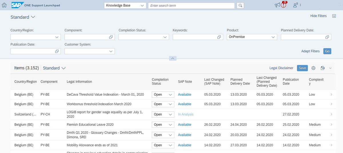 Каждый раз, когда органы государственной власти объявляют о соответствующих законодательных изменениях, команда разработчиков продуктов SAP начинает разработку изменений, которые будут включены в стандартную систему. Клиенты, пользователи и консультанты должны отслеживать эти изменения и внедрять в своих системах, чтобы своевременно контролировать исполнение процессов и операций в соответствии с требованиями законодательства. Иногда сроки, установленные Правительством, слишком короткие, поэтому, если SAP-поддержка успевает выпустить ноту или пакет обновлений, клиентам приходится очень быстро предпринимать действия для внедрения, тестирования и запуска нового программного обеспечения в своих системах. Для улучшения качества обслуживания клиентов или понимания, что нужно будет самим доабапить, по новыми изменениями в законодательстве, SAP разработала приложение «Announcement of Legal Change» (Анонсы о законодательных изменениях), которое можно найти на панели запуска ONE Support Launch