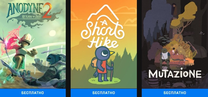 В Epic Games Store началась раздача сразу 3 игр. - Anodyne 2: Return to Dust – трогательная игра с совмещением 2D и 3D, где главный персонаж – храбрая Нова, намеренная спасти свой любимый город от ужасной Нано Пыли - A Short Hike - игра в которой нам выпала честь почувствовать себя в роли странного персонажа, он умеет карабкаться, летать, все это дело будет происходить в парке Хок-Пик, нас ждут красивые пейзажи, скалы, много леса, речки, в общем все будет красиво. - Mutazione - это от руки нарисованная приключенческая игра с глубоким сюжетом. Играете вы за девушку по имени Каи, которая отправляется в загадочное место, наполненное самыми различными мутантами, чтобы позаботиться о заболевшем дедушке. Игры можно забрать до 19 марта.