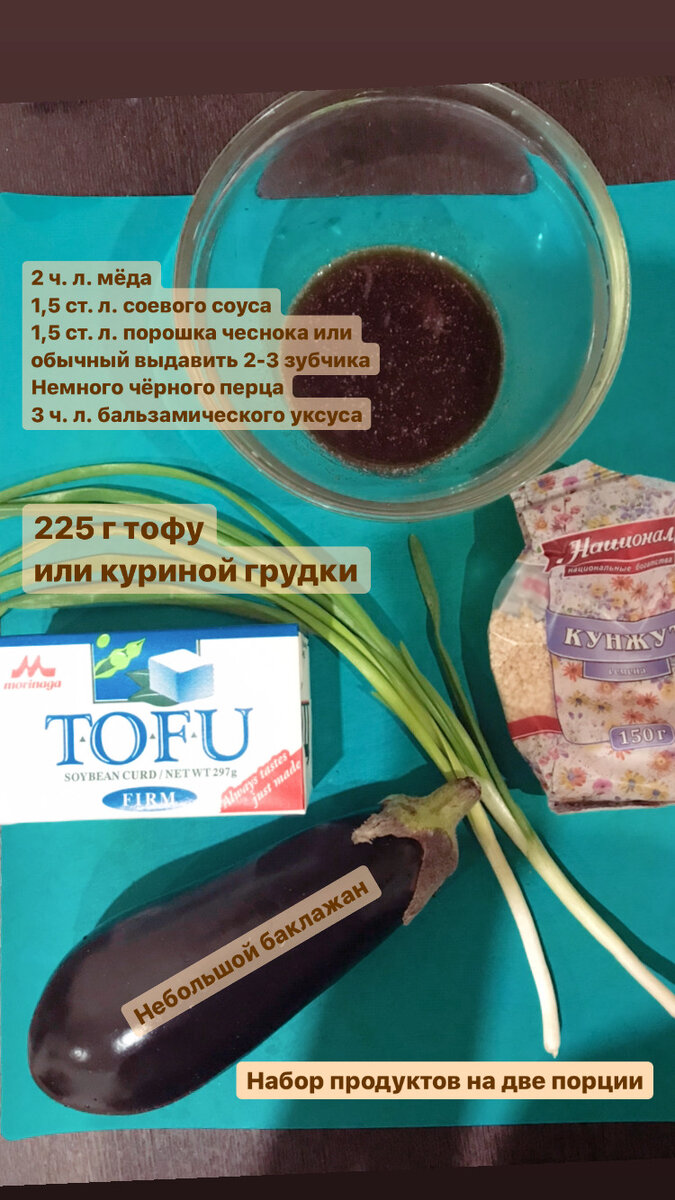 🍆Подготовка: тофу/курицу и баклажан нарезать небольшими кубиками, нашинковать лук, смешать соус в миске.