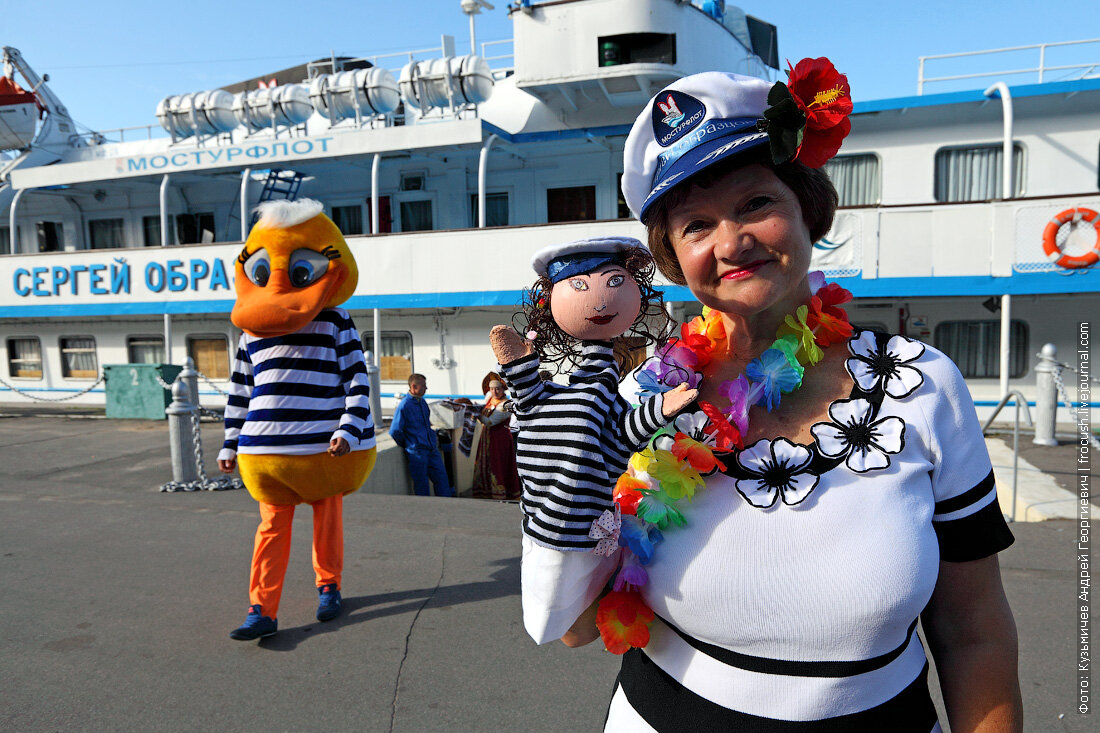 В руках у Ольги Ластовецкой, музыкального работника теплохода, кукла-петрушка. Во время одного из круизов на теплоходе «Сергей Образцов» её изготовила Бабаева Екатерина Николаевна, заслуженный артист России Государственного академического Центрального театра кукол имени С.В.Образцова. Для изготовления имиджа «Морячки», так зовут куклу, за основу были взяты: цвет волос и разре