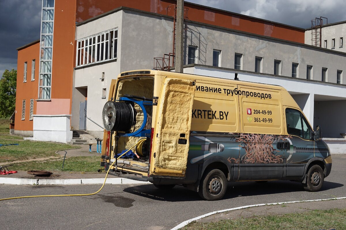 С помощью гидродинамической каналоочистительной машины можно прочищать не только трубы канализации, но и любые другие трубы. Так на пересечении улиц Свердлова и улицы Бобруйской в городе Минск, напротив автоцентра Пежо, при замене старой теплотрассы на новые пред изолированные трубы, необходимо было в старый футляр под дорогой просунуть новую плеть ПИ трубы. При первом же осмотре это оказалось невозможным и вот по чему. При демонтаже старой теплотрассы, вся тепловая изоляция, вместе со стеклотканью, стекловатой, проволокой, гипсом и прочим осталась в гильзе. За десятки лет эксплуатации, в футляр попало очень много песка. Труба была настолько забита, что не просматривалась на просвет. На наших просторах, в больших диметрах трубу зачастую, как ни странно, чистят руками – запускают под землю “специально обученного человека” и он с ведром или тазиком на веревке, складывает камни и песок из трубы в тазик, а человек на другом конце трубы вытаскивает это на веревке и потом подает тазик обр