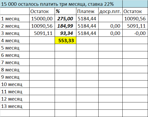 В продолжение этой статьи: Типичные заблуждения должников: часть2. Какой кредит гасить первым. Конечно же, мне написали в комментарии, что два месяца это ничего, а вот четыре года досрочного погашения это же ого-го какая экономия (написано было не так, это я пересказываю своими словами). В общем, давайте рассчитаем в таблицах все четыре года досрочного погашения. Хотя, спойлер, там будет уже не четыре, а всего 13 месяцев. Таблицы большие, широкие, поэтому мне придется их делить, так что листайте галерею! Итак, исходные данные те же: 1 кредит – 15 000 осталось платить три месяца, ставка 22% 2 кредит – 150 000 на четыре года, ставка 16% 3 кредит – 62 000 на один год, ставка 27% Общая сумма платежей у нас составляет: 5184,44 + 4241,04 + 5953,08 = 15388,56, плюс 5000 на досрочное, итого 20388,56. Это важно; в течение всего срока мы платим именно эту сумму. Разница лишь в том, как мы ее будем распределять. Вариант первый: все кредиты платим по графику, а досрочку в сумме 5000 кладем на