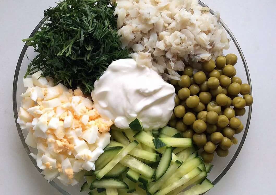 Привет, девчонки! Скоро лето, а значит пришла пора приводить своё тело в порядок! Сегодня поделюсь рецептом легкого белкового салатика, который идеально подойдёт Вам, если Вы на диете или на ПП! Что нам потребуется : Ингредиенты: - 1 варёное яйцо - 1 огурец - куриная грудка 70 г - горошек 50 г - лук 1/4 - 1 ст л сметаны или натурального йогурта - соль по вкусу Приготовление: Смешиваем все нарезанные ингредиенты и наслаждаемся полезным ужином!