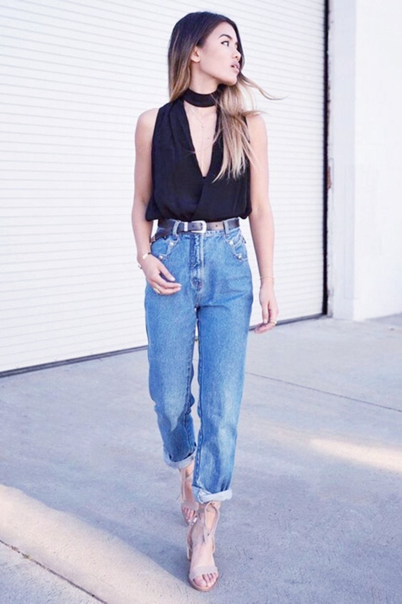 В теплое время года к джинсам подойдут однотонные майки, топы, футболки с яркими принтами. Красиво сочетаются джинсы с завышенной талией и короткие топы. В прохладную погоду к таким моделям можно надеть легкий джемпер, водолазку, свитшот, свитер, накинуть кардиган, расстегнутый жакет и т.д.