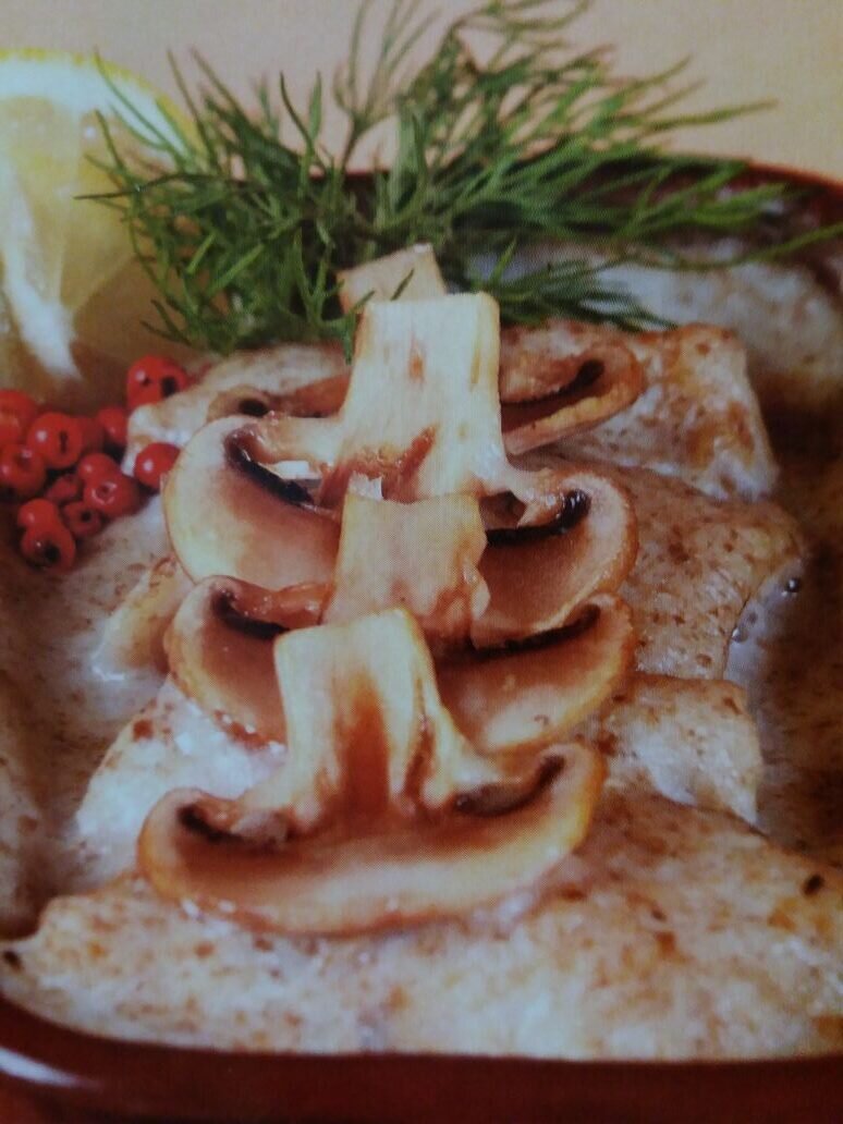 Рецепт из французской кухни. Состав: Приготовление: 1. Рыбное филе нарезать на порционные куски, посолить, поперчить. В глубокой сковороде разогреть вино с рыбным бульоном. Положить куски рыбы и тушить 10-15 минут. 2. Грибы измельчить в блендере или натереть на терке. В отдельной сковороде разогреть половину сливочного масла, припустить в нем грибы. 3. Приготовить соус "Бешамель": в кастрюлю налить молоко, луковицу очистить, разрезать на 4 части, петрушку вымыть. Положить в кастрюлю лук, петрушку, лавровый лист, мускатный орех, приправить солью и перцем по вкусу. Медленно довести до кипения, сразу снять с огня и дать настояться 30-40 минут. Протереть через сито. 4. Разогреть в кастрюле оставшееся сливочное масло, добавить муку, обжаривать 2-3 минуты. Снять с огня, тщательно перемешивая, разбавить молоком, в котором варились пряности. Вернуть на огонь, довести до кипения, варить 2-3 минуты. 5. Добавить в соус пюре из грибов, хорошо размешать. На дно формы для запекания вылить часть соус
