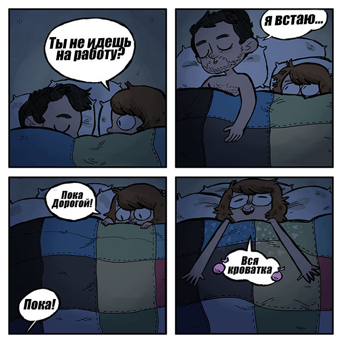 Множество иллюстраторов-художников создают комиксы про счастливые и порой даже неестественные отношения, но сегодня мы постараемся заглянуть за ширму настоящих отношений, без всякого идеализирования. Если вы нашли что-то общее с вами — делитесь в комментариях. Так же расскажите, какие забавные ситуации присутствуют в ваших отношениях. 1. Личное пространство Расставаться с любимым человеком всегда тяжело, но если этот недолгий промежуток одиночества идет на пользу вашему комфорту, то есть вероятность испытать радостные эмоции от ухода любимой половинки. 2. Причудливые вещи Никакие странные вещи гардероба любимого человека неспособны помешать искренним чувствам человека. Главное, только, чтобы таких вещей было как можно меньше... 3. Юмор в отношениях В каждых счастливых отношениях есть свой причудливый юмор, который помогает почувствовать уникальность происходящего. А у вас есть какие-то смешные шуточки с любимыми? 4. Не время обижаться Одно из самых важных правил, которое должен уяснить