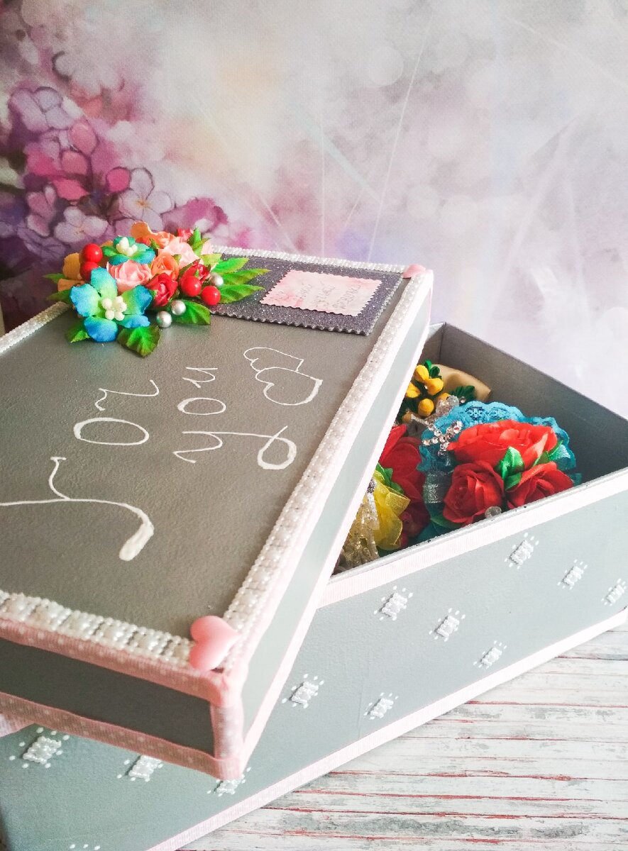 Возьмем обычную обувную коробку. Подклеиваем оторвавшиеся места, дефекты можно заклеить любым клеем, подклеить малярным скотчем или просто бумагой. Наносим грунт на коробку. У меня обычный художественный грунт. Наносить можно губкой или кисточкой. Если внутри коробки у вас чисто и нет повреждений - то грунтовать там не обязательно. Если внутренность коробки некрасивая, имеет повреждения - смело грунтуйте. Грунтуем и крышку и коробку. Далее красим коробку. Можно использовать акриловые краски, но у меня их не было. Я воспользовалась эмалью из баллона. Красить краской из баллончика необходимо на улице, или с полнотью открытыми окнами. Надевайте респиратор. Красим как снаружи, так и, при необходимости, внутри. После высыхания краски, по