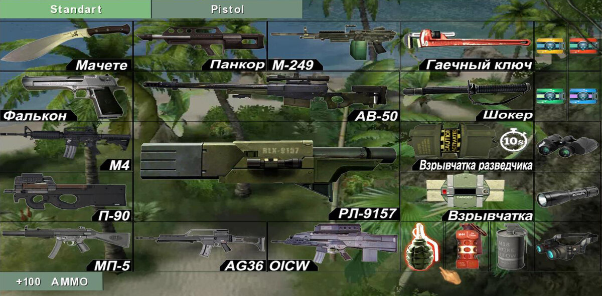 Это небольшой аддон с помощью которого можно получить любое оригинальное оружие на любом уровне в самом обычном режиме игры, без всяких заморочек с DevMode режимом. КАК УСТАНОВИТЬ: скачать файл >>>ZZZZzzzz_Weapon_Menu.pak <<< поместить его в папке Far Cry\FCData КАК УДАЛИТЬ/ОТКЛЮЧИТЬ аддон: удалить файл ZZZZzzzz_Weapon_Menu.pak в папке FCData, либо просто поменять его расширение. КАК ПОЛЬЗОВАТЬСЯ: во время игры нажмите "ESC" и вы увидите меню "Weapon". Нажимая на него попадаете в такое же окно как на скринах. Далее просто нажимайте на кнопки с рисунками оружия и оно уже в вашем арсенале. Кнопка "+ 100 AMMO" - добавляет 100 патронов к тому оружию которое в ваших руках В ИНТЕРНЕТ ИГРЕ МЕНЮ НЕ ДОСТУПНО ! СОВМЕСТИМОСТЬ: полная совместимость c оригинальной игрой, а так же со всеми модификациями где доступно стандартное оружие, примеры: К9, Назад в рай, От рассвета до заката, Антитеррор, BlodeRange В Far Cry по Русски 1-2 аддон тоже работает, только оружие некоторые другие, например при н