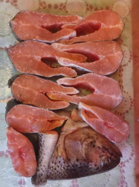 Здравствуйте, дорогие друзья! Сегодня посчастливилось купить в Перекрестке форель потрошенную с головой по цене 369 руб. / кг. У нас покупка вышла чуть меньше килограмма на 330 руб. Рецепт приготовления стейков рыбы очень прост. Нам понадобиться: Для начала, мы чуть-чуть заморозили форель (для удобства резки на стейки). Порезав тушку форели на стейки, нужно смазать нашу форму для выпечки подсолнечным маслом и разложить стейки в форму. Далее, полученные стейки, необходимо посолить и поперчить по вашему вкусу, сбрызнуть лимонным соком с двух сторон. Ставим форму, в разогретую духовку до 175-180 градусов на 20 минут, далее переворачиваем наши стейки и ставим ещё на 15-20 минут. Идеальные по вкусу, тающие во рту стейки готовы. На гарнир к нашим стейкам идеально подойдет пюре(картошка) или овощи . Всем приятного аппетита! Спасибо за внимание!