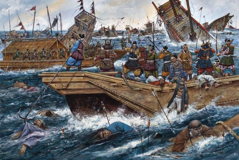 Монгольская империя дважды предпринимали попытки захватить Японию . В 1274 году собрав флот и посадив на него до 37 тысяч войнов(монголы и войны порабощённой Кореи) высадились на острова Цусима и Ики , с лёгкостью разбив японские отряды опустошили эти острова . После чего подошли к острову Кюсю и начали обстрел из огнеметательных орудий . Внезапно начался тайфун и повредил часть судов , а за одно погиб командующий монголов и они убрались во свояси . 1281 году , два монголо-корейско-китайских флота из Кореи и Южного Китая направились к острову Кюсю . Численность войнов посаженных на корабли достигала ста тысяч . Первым прибыл малочисленный флот из Кореи , нападение которого японцы сумели отбить , но вскоре подошла основная часть флота . Соотношение сил было примерно 10 к 1 не в пользу Японцев и сами японцы понимали , что обречены . Но снова поднялся ураганный ветер , разразился шторм который и разметал большую часть вражеского флота , уцелевшие же корабли убрались домой . После дв
