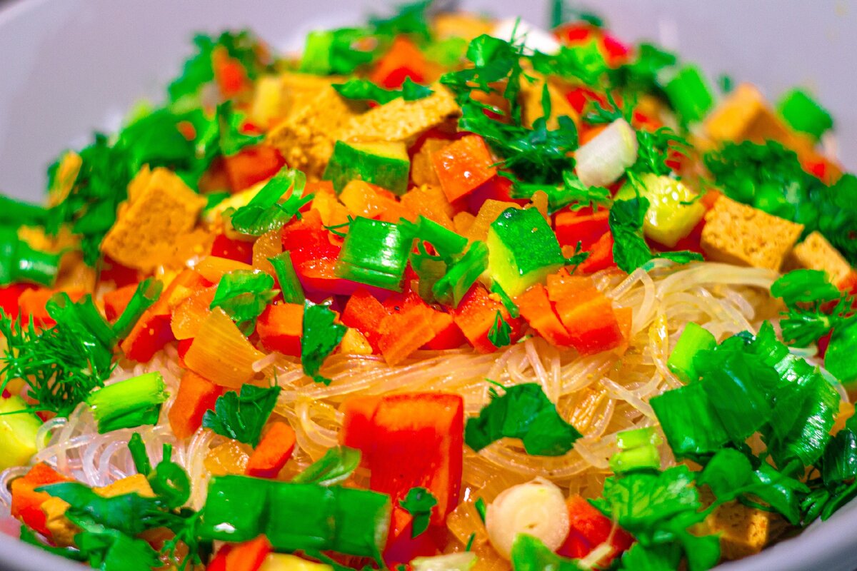 Один из способов, чем занять себя во время самоизоляции – готовить вкусную еду. Почему бы и нет? В общем экспериментировать в области кулинарии. Если раньше постоянно не хватало на это времени, то сейчас его предостаточно. Теперь появилась возможность приготовить то, что вы давно хотели, но постоянно откладывали. Да и одни и те же блюда надоели, согласитесь. От некоторых уже просто воротит. Все эти борщи, гречки, яичницы. Вот оно, то самое время начать готовить что-то новое. И поверьте, для этого не нужны какие-то необычные продукты. Всё то же самое, что вы используете всегда. Все эти новые блюда разнообразят ваш рацион, придадут ярких красок и впечатлений в этот непростой период. Недавно мне захотелось лапшу с овощами. Но обычные макароны мой организм перестал воспринимать. И было принято решение сделать блюдо более легким и витаминным. В итоге я выбрала рисовую лапшу с овощами, зеленью и тофу. Результат мне очень понравился, и я решила поделиться рецептом с вами. Так что давайте про