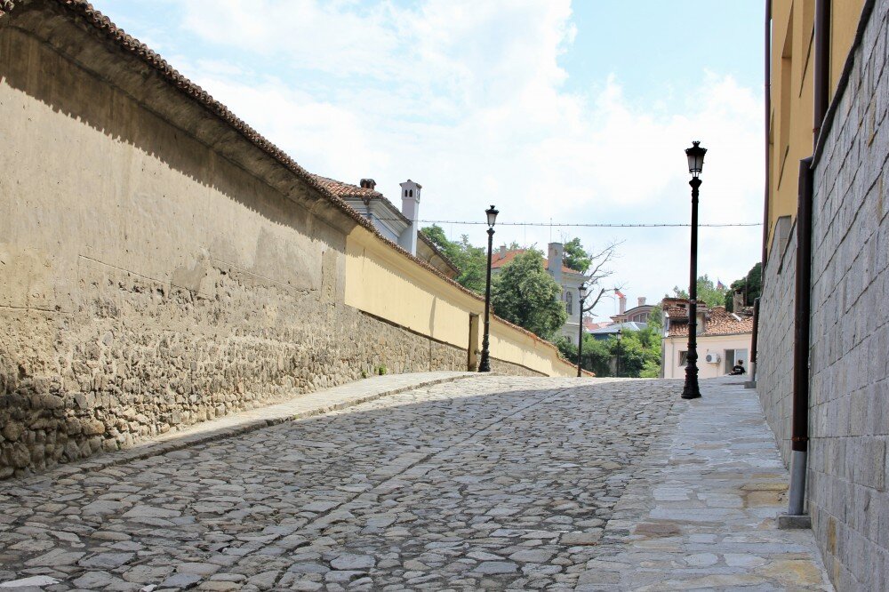 Самое главное - удобная обувь. Каблуки и мокасины на тонкой подошве нам не подходят, потому что гулять мы будем по...болгары называют такое каменное покрытие - калдъръм. Люблю этот указатель. Куда бы ты не пошел, найдешь что-то интересное. Отмечены самые значимые объекты, а по дороге можно наткнуться, например, на такого истукана. Явно древний, но ни таблички, ни надписи и никто не стащил до сих пор. Моя любимая прогулочная дорога - от античного театра до старой крепостной стены. На карте это - от цифры 2 к цифре 1. Первые крепостные стены были сооружены во времена Филипа II Македонского (342 г. пр. Хр.). Античные, средневековые и памятники возрождения существуют по соседству на территории Старого города.
