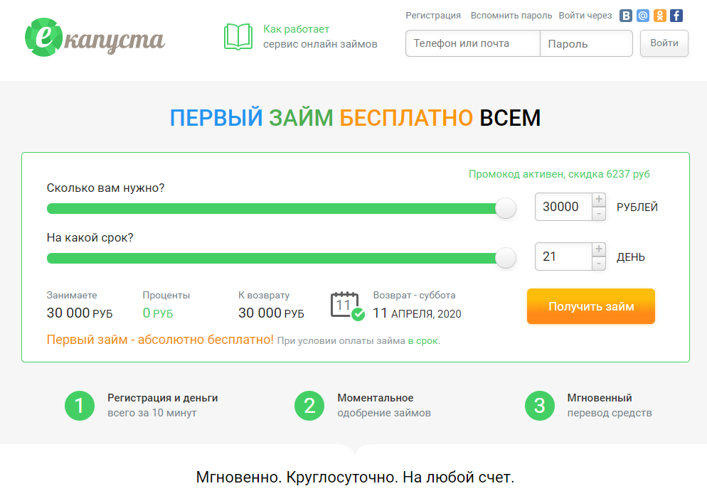 Займ на карту. Это не кредит за которым мы пойдем в банк и будем ждать долгого одобрения. Займ - это всегда быстро, вам срочно нужны деньги, вы обращаетесь в МФО, быстро берете займ и делаете свои дела. Сейчас это доступно сделать онлайн и МФО про которую я написал ниже вас порадует. Не каждая МФО дает моментальный ответ на вашу заявку. Но вот еКапуста дает моментальный ответ, с быстрыми выплатами. Очень удобная организация, не много подробнее о ней ниже. ПЕРВЫЙ ЗАЙМ БЕСПЛАТНО ВСЕМ еКапуста · Регистрация и деньги всего за 10 минут · Моментальное одобрение займов · Мгновенный перевод средств Мгновенно. Круглосуточно. На любой счет. Самое главное преимущество данного МФО, это очень быстрые рассмотрения решений и мгновенные выплаты. Не каждое МФО может заявить, что выдаст вам деньги практически сразу после рассмотрения заявки. Вдобавок к этому еще и на любой счёт. Основные преимущества еКапусты Сайт доступен с любого устройства, а это значит, что вы можете взять займ, даже не имея