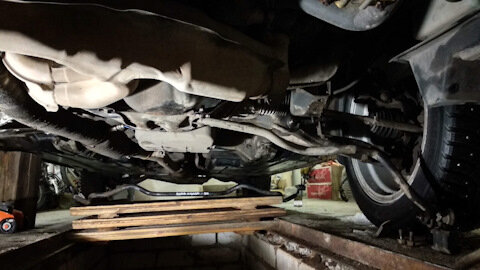 Первым под мою руку попался передний стабилизатор. Долго я спотыкался об "новые" стабы, ходя вокруг машины… Теперь пришло их время. Открутилось все нормально, заранее замочил все болты ВД-40. Снял только кронштейны самого стаба и центральный кронштейн под защиту. Выхлоп не отворачивал. Вытащил стаб даже не отворачивая кости.