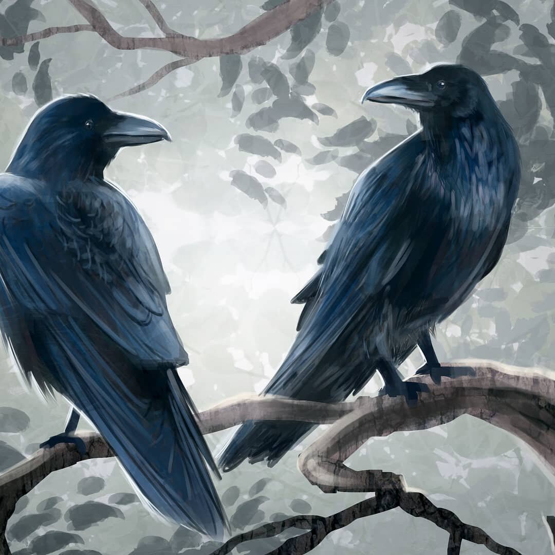 Неизменные спутники отца богов. Вместе с волками Гери и Фреки они дополняют образ всезнающего мудрого бога. Облетая весь мир, они приносят Одину вести о том, что в нем происходит. Их имена означают «мысль» (от huga — «думать»), и «память» (от muna — «помнить»). Другой вариант происхождения имени Мунина: от munr, означающего «разум». Вот упоминание воронов Одина в Старшей Эдде, в «Речах Гримнира»: Huginn ok Muninn fljúga hverjan dag Jörmungrund yfir; óumk ek of Hugin at hann aftr né komit, þó sjámk meir um Munin. Хугин и Мунин над миром все время летаю... Каждое утро О́дин посылал своих верных спутников на дело, и каждый вечер они возвращались к нему обратно. Они садились ему на плечи и нашептывали в уши воспоминания и мысли, которыми поживились за день. Таким образом О́дин узнавал обо всём, что происходило в мире, ни одна мысль, ни одно намерение не могло укрыться от него.