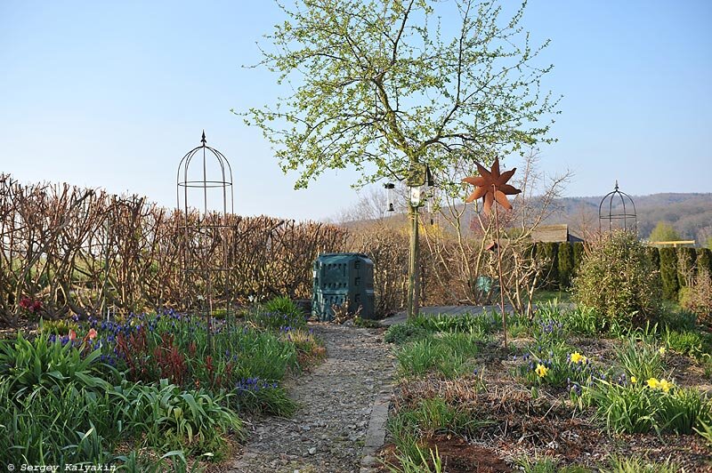 Всю неделю днем было от +10°С до +15°С, а ночью - слабые заморозки. На тюльпаны, нарциссы, гиацинты и мускари они не повлияли, а вот розам досталось. Гиацинты в грунте, кстати, уже отцветают. Вот, последняя приличная куртинка осталась. Крокусы уже отцвели, доцветает только покупная поздняя выгонка. Цветут тюльпан Грейга 'Calypso' цвета пионерского галстука и пурпурный тюльпан красивенький 'Persian Pearl'. Только собирается зацветать тюльпан Грейга 'Red Riding Hood'. К сожалению, на прошедшей неделе крот снова начал свирепствовать и разрыл тюльпаны и раритетный флокс 'Blue Paradise' (потому что этот экземпляр я покупал еще в питомнике Удольфа). Я, конечно, разозлился, и в отместку снова посадил в кротовины покупные выгоночные гиацинты. Зацвели практически все сорта нарциссов, которые у меня растут. Хочется побольше белых. Продолжают цвести мускари широколистный и армянский. Мускари широколистный теперь и правда растет полянками. Красные побеги - это молочай Гриффитта 'Dixter'. Кстати, о