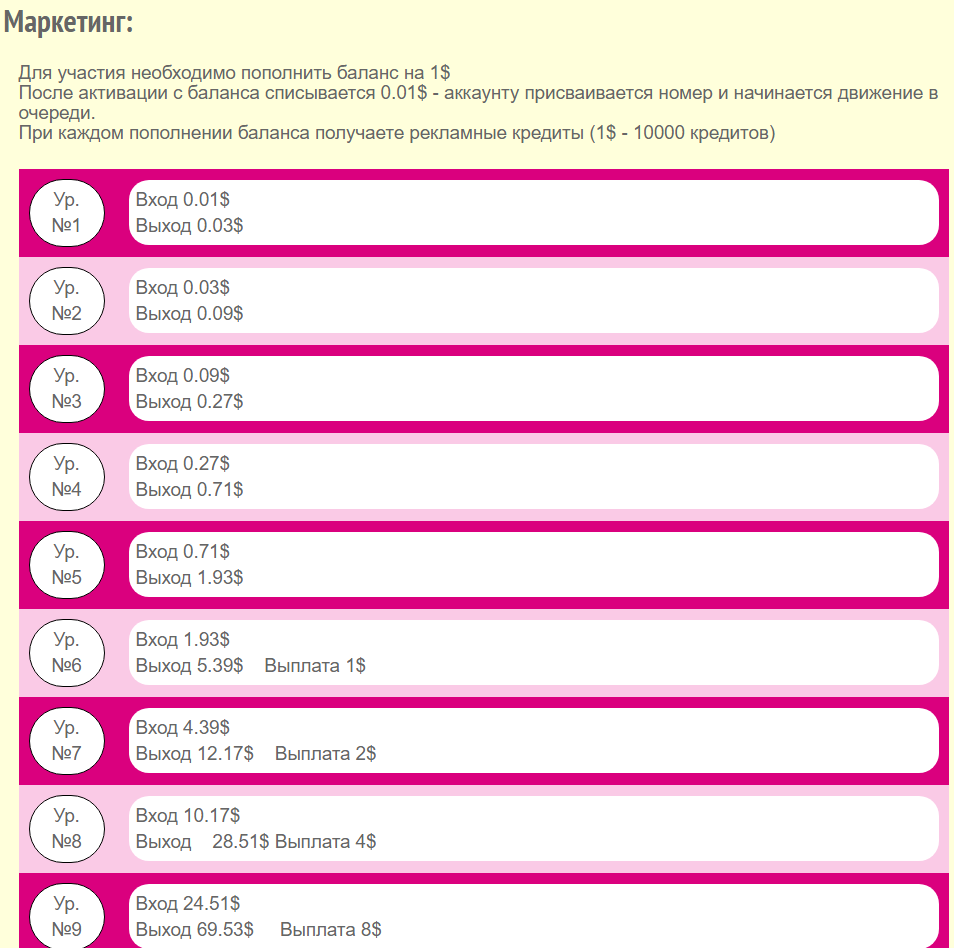Ежедневно с баланса акка снимается 3 цента, создается клон и ставится в конец очереди. Таким образом она движется сама! А если хочешь большего заработка, можно создавать мультиаккаунты. К примеру для участия в этой акции) И так давайте, разберем подробнее маркетинг: Кроме того, если у тебя есть мультиакк или реферал, то ты будешь получать доход с каждого его перехода на новый уровень! Я просмотрела выплаты с проекта за неделю, конечно большинство по нескольку долларов, однако есть несколько за 10, 11, 12 уровни. А это уже 16, 48 и 144 доллара соответственно! Кроме того, вкладывая 1 доллар ты получаешь кредиты (1$ - 10000 кредитов), которые можешь тратить на рекламу других проектов или своего сайта. ------------------------- Так вот сейчас, на п
