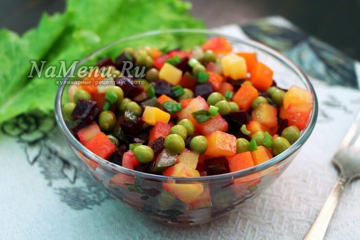 Ингредиенты: ✔️репа крупная – 1 шт.; ✔️морковь – 1 шт.; ✔️свекла – 2-3 шт.; ✔️огурцы маринованные или соленые – 3 шт.; ✔️горошек консервированный – 450 г; ✔️масло подсолнечное (ароматное) – по вкусу; ✔️уксус яблочный – 1 ч.л.; ✔️лук зеленый (по желанию) – 1/2 пучка; ✔️соль – по вкусу; ✔️сахар – 1 щепотка. 🥕Морковь и репу очистить и нарезать кубиком. Отправить вариться в подсоленной воде, в отдельных кастрюлях. Готовые овощи откинуть на сито и промыть водой 🔪Свеклу сварить в кожуре отдельно до готовности, очистить, нарезать кубиками 🌱Зеленый лук мелко нарезать 🥒Огурцы нарезать кубиком 🥣Добавить горошек. Всыпать щепотку сахара, влить уксус и заправить подсолнечным маслом https://namenu.ru/11689/Vinegret_s_repoj_vmesto_kartoshki/