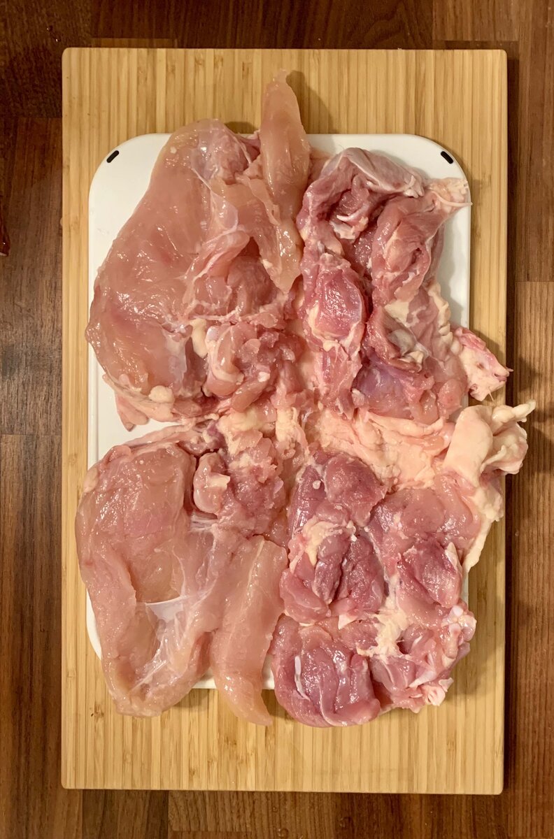 Много переделал рулетов и вот еще один. Очень неплохой. Говорят, что даже хороший. Рассказать? :) Хорошо, уговорили. Я решил немного поменять формат изложения. Сначала я описываю рецепт, процесс и делюсь впечатлениями, а потом пишу граммовки и прочие условия. Потому что рецептов в мире миллионы, а я просто делюсь опытом и впечатлениями. Основа сегодняшнего рулета целая курица, отделенная от костей. Делим ее вдоль, что бы у каждой половины была часть грудки и часть бедра. После разделки я ее предварительно засолил в поваренной соли из расчета 1,6% соли на кг продукта. Говядины взял на глаз, столько сколько получилось купить в магазине, т.е. строго на глаз. Примерно вот так. К говядине я добавил выступающие части курицы (мясо, кожу и жир). Все это я порезал на кубики по 1 см. (наверное можно было бы пропустить через мясорубку с самым большим диаметром решетки). К этому фаршу необходимо добавить воду, соль и специи. Взвешиваем фарш. Добавляем 20% воды. Для точности я ее тоже взвесил. По