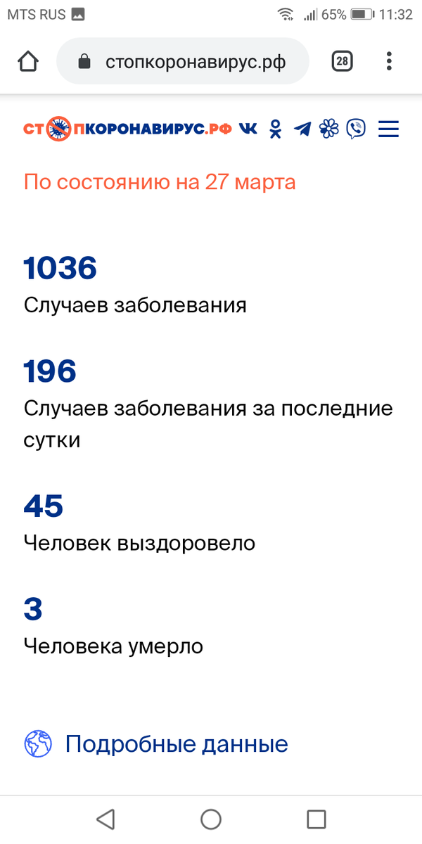 За последние сутки заболело 196 людей, всего в России заболевших 1036 людей, выздоровело 45 людей, и скончались 3 человека