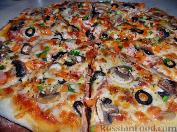 Сегодня я вам расскажу как приготовить пиццу с ветчиной и грибами. Этот рецепт весьма необычен. Сначала мне показалось что у меня не получится приготовить. Но у меня всё получилось, и главное-очень быстро. Продукты (на 4 порции) Тесто: мука - 1,5 стакана, соль - 2 щепотки, сахар - 1 ч. л., сухие дрожжи - 2 ч. л., вода - 3/4 стакана, растительное масло - 4 столовых ложки. Основа: растительное масло для обжаривания, мелко рубленный чеснок, 2 столовых ложки томат-пасты, 100 г воды, соль, базилик. Начинка - пропорции на ваш вкус, привожу перечень: ветчина, сервелат, грибы, оливки, сыр Моцарелла, болгарский перец, орегано, чеснок, базилик, томат-паста. 1. В муке делаем воронку. Добавляем соль, сахар, дрожжи, масло и ХОЛОДНУЮ воду. Замешиваем тесто и ставим его отдохнуть всего на 30 минут. 2. На раскатанное тесто кладём основу: на растительном масле обжариваем мелко рубленный чеснок; потом добавляем 2 столовых ложки томат-пасты, грамм 100 или больше воды, солим, добавляем базилик и