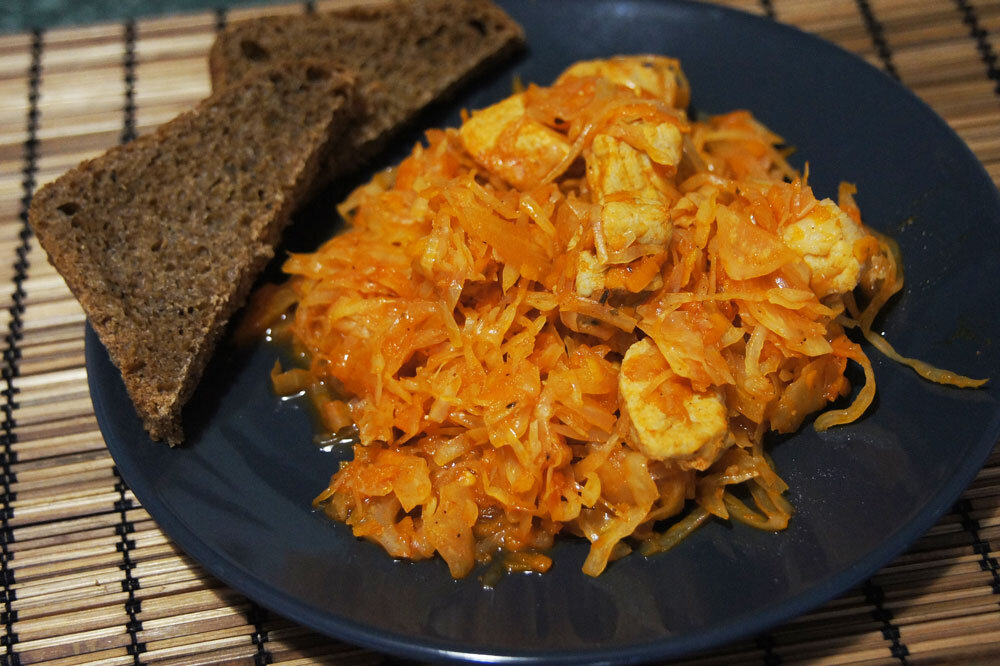 Капусту шинкуем мелкой соломкой, лук – полукольцами. В сковороде с раскаленным маслом обжариваем лук, затем томатную пасту и добавляем капусту. Немного обжариваем ее, перемешивая с томатной пастой и луком, добавляем полтора стакана горячей воды. Когда масса закипит, уменьшаем огонь и тушим капусту до мягкости. Это займет 30-40 минут. За 10 минут до конца тушения капусту перчим и солим, добавляем уксус, сахар и лавровый лист, корректируем по вкусу.