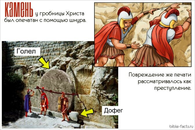 Камень у гробницы Христа был опечатан с помощью шнура, натянутого через камень и опечатанного на обоих концах, как в Дан. 6:17. Нить была протянута поперек камня и опечатана с обоих концов специальной глиной.