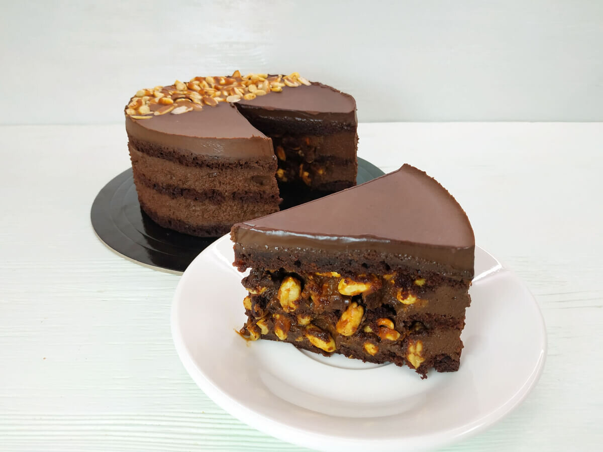 Промазываем корж кремом. Делаем бортики из крема. В середину выкладываем арахис с карамелью. Накрываем вторым коржом и повторяем действия. Накрываем третьим коржом и заливаем шоколадной глазурью.