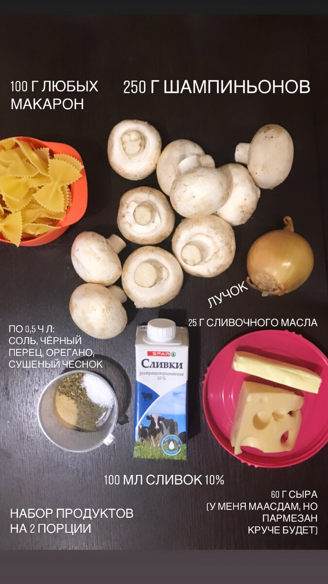 Ни разу не веганский, но нежно любимый мой фирменный рецепт пасты с шампиньонами 😍 ⠀ 🔪 Приготовление: Поставить вариться пасту (готовьте по времени как написано на упаковке). В воду кроме щепотки соли добавлять больше ничего не нужно, тем более масло! Нашинковать тонко лук, шампиньоны, на мелкой терке натереть сыр. Ещё раз - лучше пармезан! На сковороду налить растительное масло, на него положить сливочное (чтобы не сгорело) и разогреть. ⠀ Еда - готовься! 1️⃣ обжарить под закрытой крышкой лук, на среднем огне минут 4-5 ⠀ 2️⃣ к луку высыпать шампиньоны. Сначала покажется, что их очень много. Приправить специями, солью, перемешать. Закрыть крышкой. ⠀ 3️⃣ через 5 минут шампиньоны значительно уменьшатся, дадут сок. К соку подливаем 2 ст л воды, в которой варятся макароны. Вливаем сливки, перемешиваем, закрываем крышкой. Тушим ещё 3-5 минут на медленном огне. ⠀ 4️⃣ готовую пасту не надо под холодную воду - откинули на дуршлаг и сразу же в сковороду, к соусу. Перемешать, дать прогреться