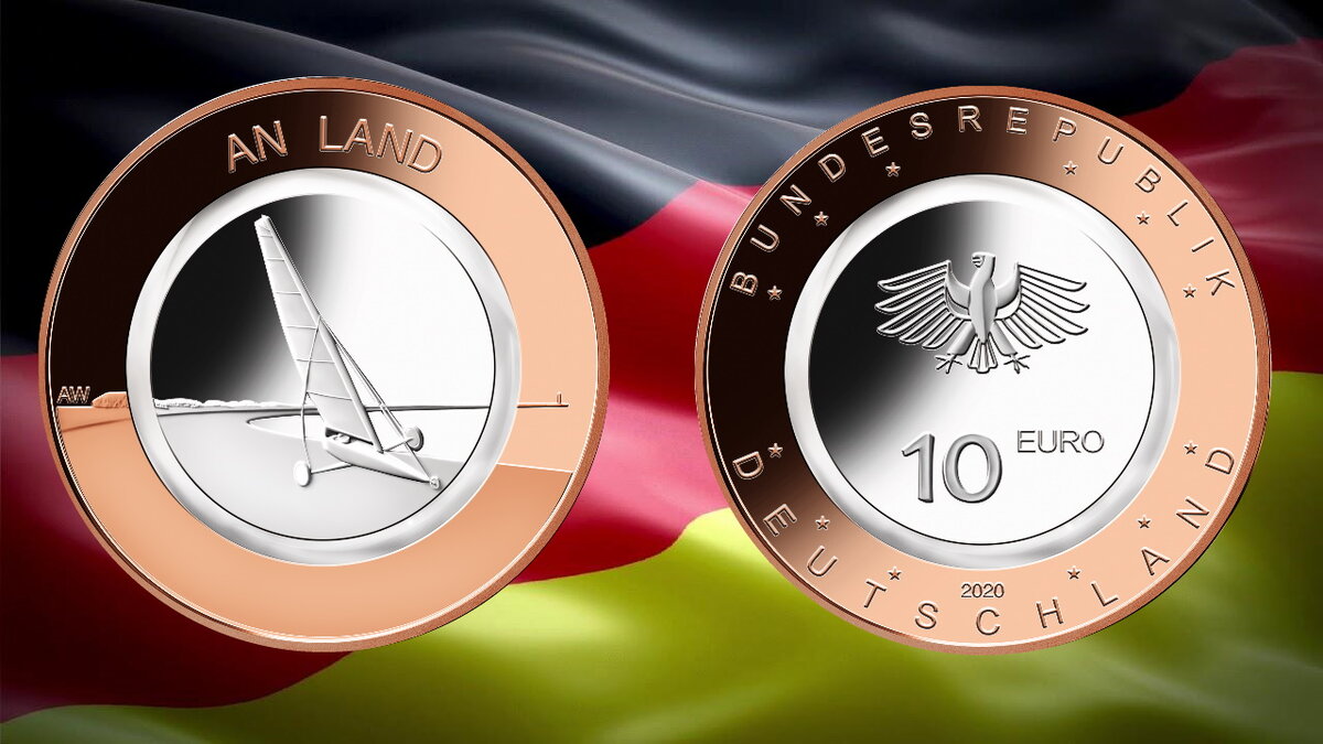 10 евро «На суше» является вторым изданием серии из трех монет «Воздушные ходы». В этом году монета посвящена динамичным трендовым видам спорта, в которых единственный способ передвижения - это воздух или ветер. Выбранный монетный мотив 2020 года приветствует парусный спорт на пляже. Памятная монета 10 евро "На суше" состоит из внутреннего медно-никелевого сердечника с внешним красным бронзовым кольцом . Между двумя металлическими компонентами имеется прозрачное полимерное кольцо. Первоначально запланированная первая дата выхода в обращение 26.03.2020, но выход отложили на неопределенный срок из-за напряженной ситуации в связи с коронавирусом (COVID-19)