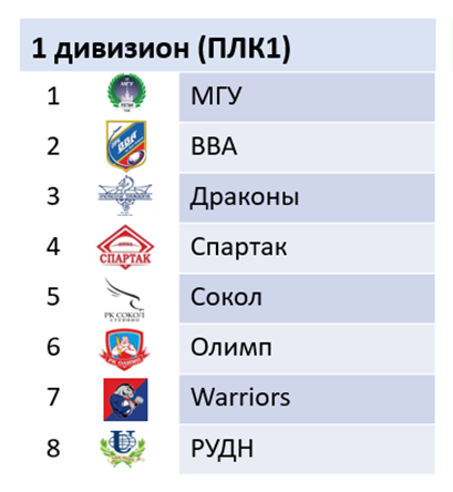 Переходим к нижнему турниру – Первенству Москвы среди мужских любительских команд. Давайте привыкать к новым названиям, новым схемам и принципам, поскольку даже неправильное использование синонимов приведет к ошибкам восприятия. Итак, Первый дивизион Первенства сформирован на базе бывшего Второго дивизиона ЧМ с добором команд: Как видите, среди участников соревнований нет ЛРК «Торпедо» и «Московских Драконов – 2». Это определенные потери для регбийной семьи, но приобретения для базовых клубов: не нужно распылять состав на несколько команд и турниров, и полностью сконцентрироваться на решении единой стратегии. Среди новичков, в первую очередь, отметим «Московских Драконов», во вторую – ступинский «Сокол», который рискнул дебютировать в столичном первенстве. По добору в Первом дивизионе дебютируют «Олимп» и «Варриорс». Первые заняли вакантное место, освободившееся после резкого перехода «Армейцев» в Чемпионат Москвы, вторые – на «дыру» из-под ЛРК «Торпедо», как лучший клуб по рейтингу ср