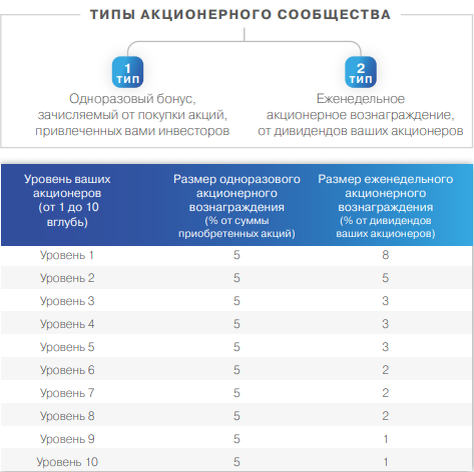 О ПОСТРОЕНИИ СВОЕГО АКЦИОНЕРНОГО СООБЩЕСТВА Компания предлагает возможность создания собственной команды, или, иначе говоря, собственного акционерного сообщества с 10-уровневой системой, которую можно разделить на 2 типа: Если расшифровать таблицу 2, то получается, что одноразовый бонус доступен до 10-ти уровней в глубь, по 5 процентов, то есть если все они приобретут акций на 100$, то за каждого из участников акционерного сообщества клиент получает по 5 $ вплоть до 10-ого уровня. Еженедельное начисление акционерного вознаграждения от прибыли привлеченных инвесторов работает по такому же принципу до 10-ого уровня, с процентами, указанными в таблице 2. Предположим, что привлеченный вами партнер 1 уровня приобрел акций на 100 $, соответственно каждую неделю он будет получать, 8 долларов, исходя из таблицы 2, а это значит, что вы как глава вашего акционерного сообщества будете получать 8 процентов от 8 долларов, т.е. 0,64 $, и так с каждым из ваших 10 акционеров согласно процентной
