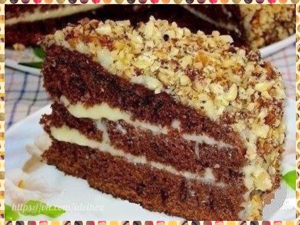 Ингредиенты: Для теста: ●Кефир или простокваша -300 г ●Сахар – 1 стакан ●Яйца – 2 шт. ●Растительное масло – 2 ст. л. ●Какао – 2-3 ст. л. ●Сода – 1 ч.л. ●Мука – 2 стакана Для крема: 1- вариант – сметанный крем ●Сметана – 400 г ●Сахар – 1 стакан ●Масло сливочное -200 г 2- вариант – заварной крем ●Яйца – 2 шт. ●Сахар – 300 г ●Мука-2 ст. л (с горкой) ●Молоко – 400 г ●Ванильный сахар – 1 пакетик ●Масло сливочное -200 г ●Для обсыпки –печенье, или шоколад, или орехи Приготовление: 1.Тесто для этого шоколадного торта готовится очень просто. В одной миске слегка взбить яйца, растительное масло и кефир, т. е., то, что жидкое. В другой – всё сухое: муку, сахар, соду какао. 2.В посуду с сухой смесью влить взбитые яйца, хорошо перемешать. Вылить в смазанную маслом форму, поместить в разогретую духовку.Выпекать 50 минут при температуре 200-170 градусов. Охлаждённый пирог разрезать вдоль на 3 части, перемазать кремом, сверху посыпать шоколадом или орехами. 3.Готовим крем