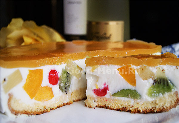 Классический торт "Битое стекло" обычно готовится из цветного желатина. Оно, конечно, красиво, только вот полезного в таком торте мало, поэтому я слегка модифицировала общепринятый рецепт: вместо цветного желатина использую консервированные фрукты. Торт Битое стекло с фруктами получается еще более красивым и аппетитным, и самое главное – он без красителей. Готовится тортик без выпечки, очень быстро и просто. Попробуйте, отличный десерт, особенно в летнюю жару.