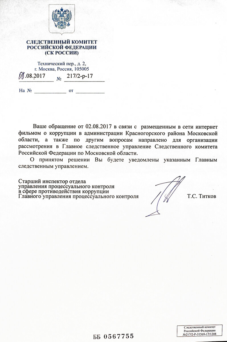 Закон "О противодействии коррупции" к основными принципами её противодействия относит неотвратимость ответственности за её совершение, признание, обеспечение и защита основных прав и законность действий, формально как стоявшее задачей СК РФ исходя из изложенного. Как и было указано ранее, и в общем отдел СКР далеко не ушел от УВД и Прокуратуры Красногорска, никакого ответа, а именно постановления следователя с установленными фактами и основанием отказа, с нарушением сроков рассмотрения получить не удалось и это не без оснований. (другое быть наверно и не могло, ведь минимум только прокурор Лаврухин Р.В. который увел от уголовной ответственности злоупотребив должностными полномочиями, бывший следователь по особо важным делам данного отдела и лишь приходиться задуматься : сколько за свою службу в СКР он мог спустить такой коррупции давая отказной материал и защищая кошельки чиновников против Народа).