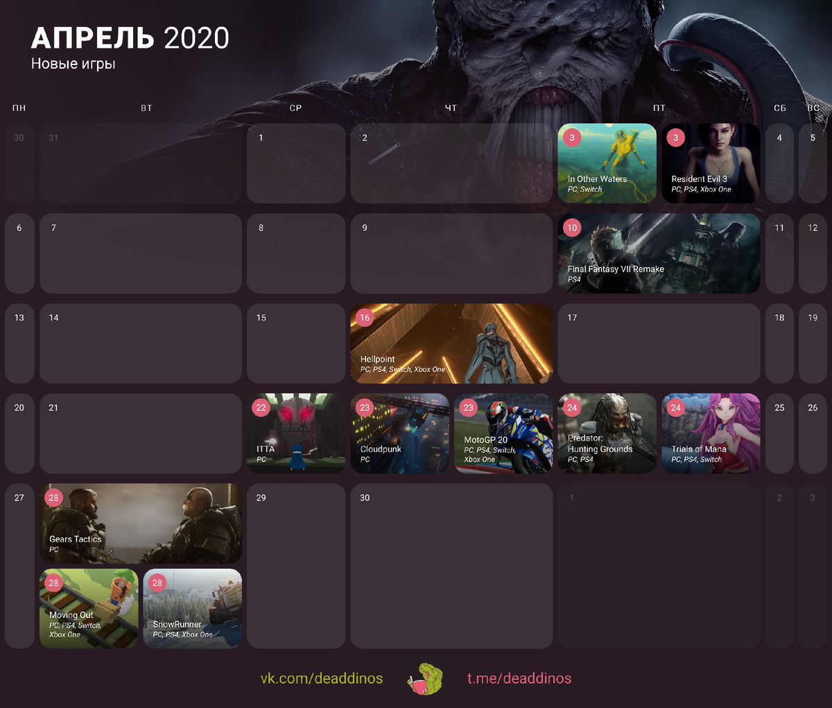 - Resident Evil 3 — 3 апреля (PC, PS4, Xbox One)