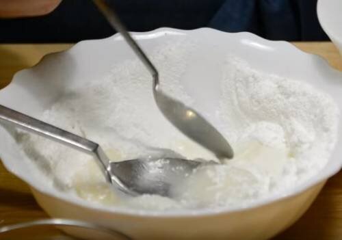 3. Добавьте вначале треть пуды и перемешайте ее с белком до исчезновения комков. Затем положите следующую часть и так постепенно вмешайте всю.
