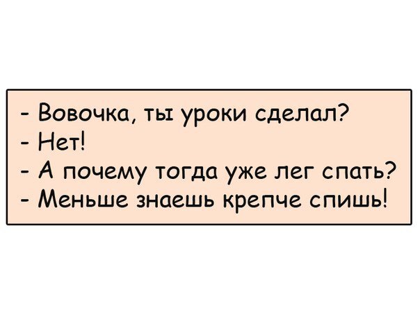 Вовочка и школа √1 Урок в школе. Учительница: - Дети, я сейчас вам скажу стишок, а вы его продолжите. Если я б имел коня... Руку тянет Вовочка. Учительница:- Нет, Вовочка, я не стану тебя спрашивать, вот давайте послушаем Васеньку. Васенька.- Если я б имел коня, конь бы слушался меня! Вовочка опять тянет руку. Учительница:- Ну, ладно, давай ты... Вовочка: - Если я б имел коня, это был бы номер, Если б конь имел меня, я б, наверно, помер... Кончились летние каникулы. Учительница в школе просит детей рассказать - кто что летом делал, чему научился, что полезного из этого вынес. Маша: - Мы с мамой и бабушкой все лето провели на садовом участке. Мы сажали разные овощи, я поливала грядки и пропалывала сорняки. Учительница: - Молодец, Маша. И что же ты поняла? Маша: - Я поняла, что все живое требует бережного ухода, и чтобы собрать богатый урожай, надо много потрудиться. Иван: - А мы с папой все лето провели на охоте и на рыбалке. Я научился ставить палатку, разжигать костер. А е