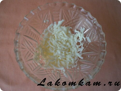 Яйца разделить на белки и желтки. Белки натереть на тёрке: