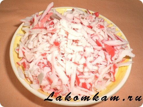 Салат «Нежный». Ингредиенты: 250 грамм крабовых палочек; 3 варёных яйца; 3 варёных моркови; 1 средняя луковица; майонез.