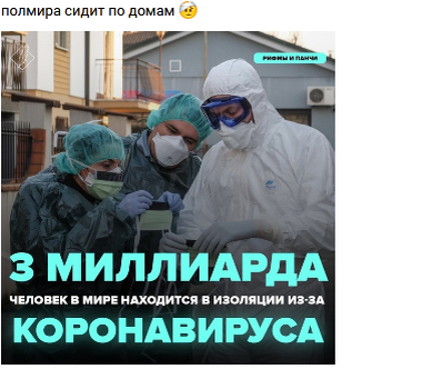 Из за коронавируса полмира сидит на карантине. Все школы в СНГ закрыта до 12 апреля.А число погибших от коронавируса перешло за 25тыс человек.Сейчас все готовятся к семи дневному карантину, покупают крупы, макароны, туалетную бумагу, антисептики и тд. А Американская модель Кайли Дженнер пожертвовала 1.000.000$ на борьбу с коронавирусом. По ее словам, пожертвование пойдет на закупку медицинских масок, защитных щитов, перчаток и других средств индивидуальной защиты для врачей, которые работают в реанимациях и отделениях интенсивной терапии. И ещё одна известная личность заразилась коронавирусом, премьер-министр Великобритании Борис Джонсон. 196 новых случаев COVID-2019 в России за сутки в 16 регионах. Всего 1036 случаев в стране. В 58 регионах. Также в Москве зафиксирована третья смерть от коронавируса. Вообщем желаю всем здоровья,как можно минимизировать связь с внешним миром,и чаще мойте руки.