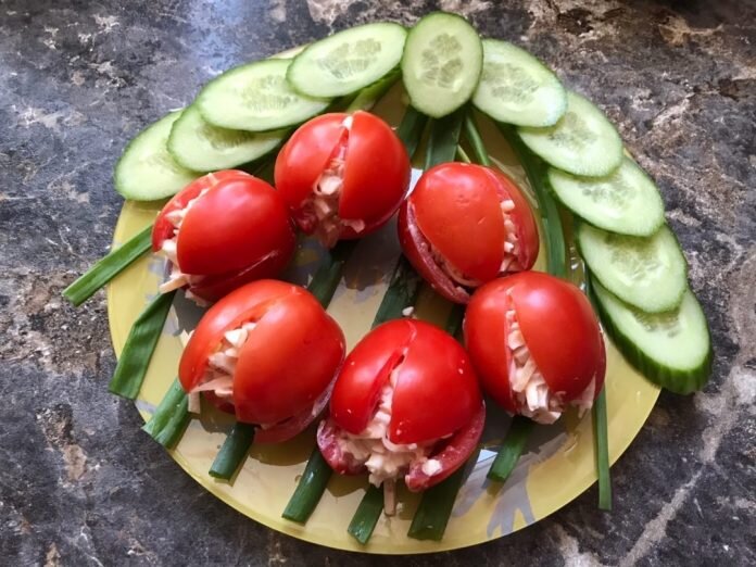 Праздничная и шикарная закуска-салат к яркому приему гостей! Какие чудесные, нарядные, интересные и вкусные получились томаты. Можно попробовать сделать из разных помидор — оранжевых, красных, желтых — получится целый букет цветов.